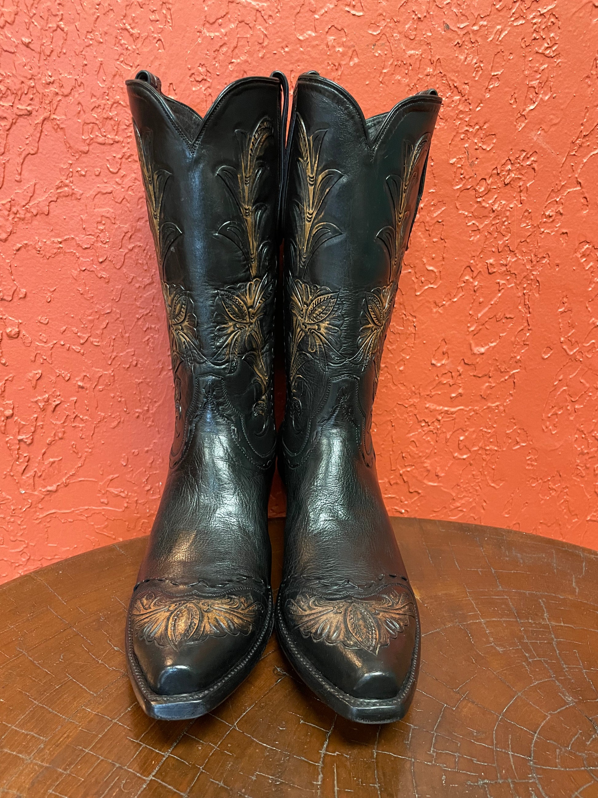 - Black and Tan Antiqued Tooled Wingtip, Heel Foxing, Tube, and Pullstraps