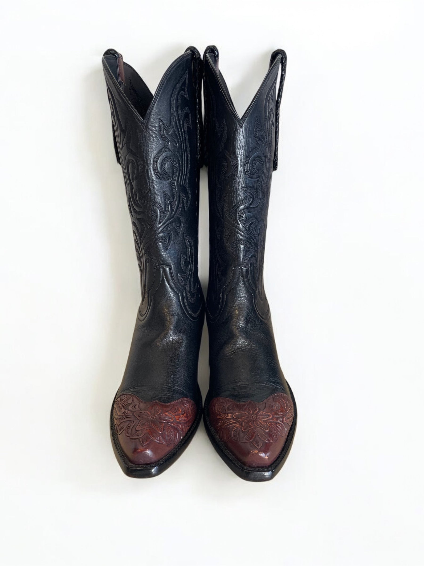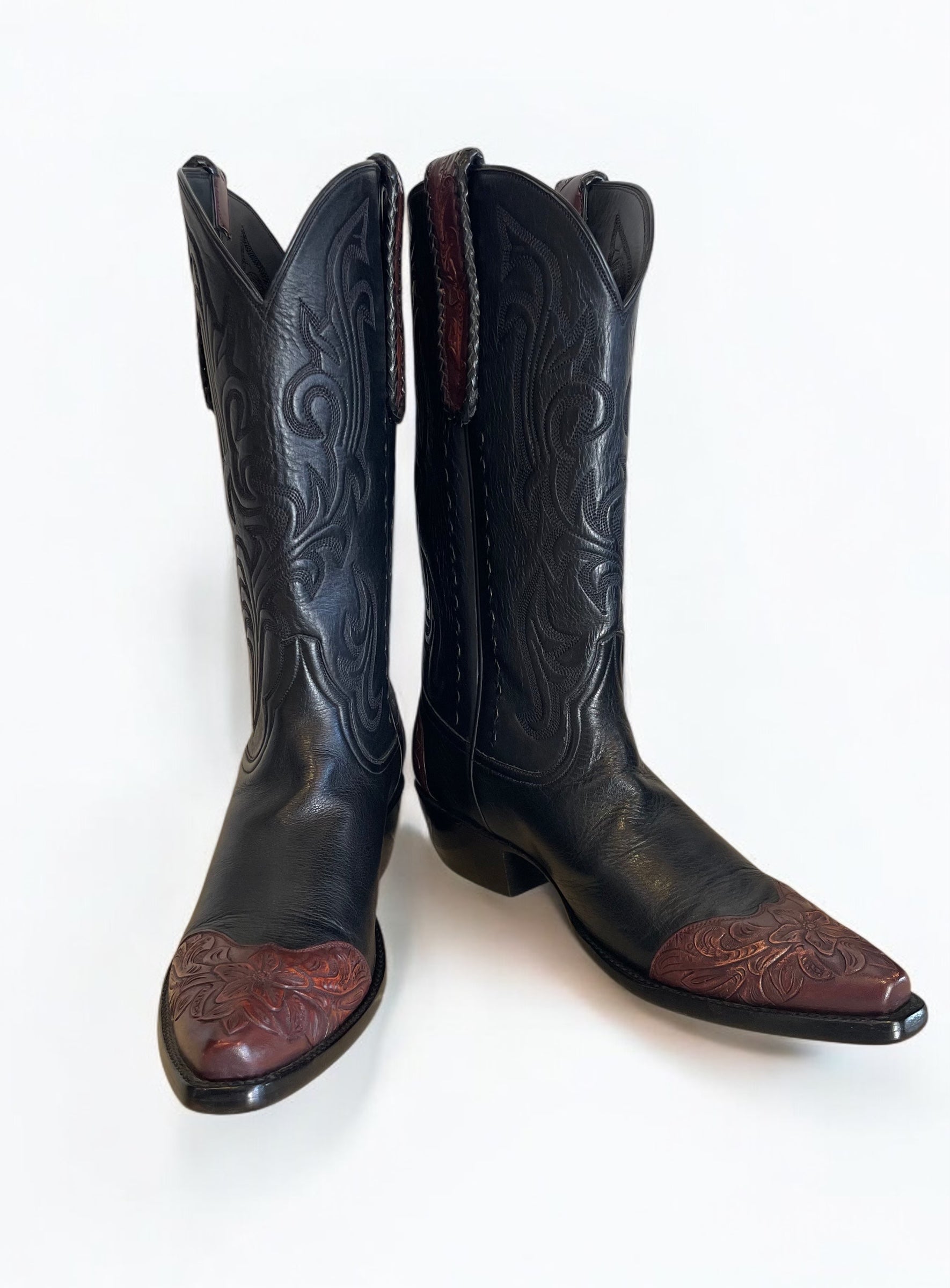 Water Buffalo Calf Western with Tooled Trim in Noir and Sport Rust